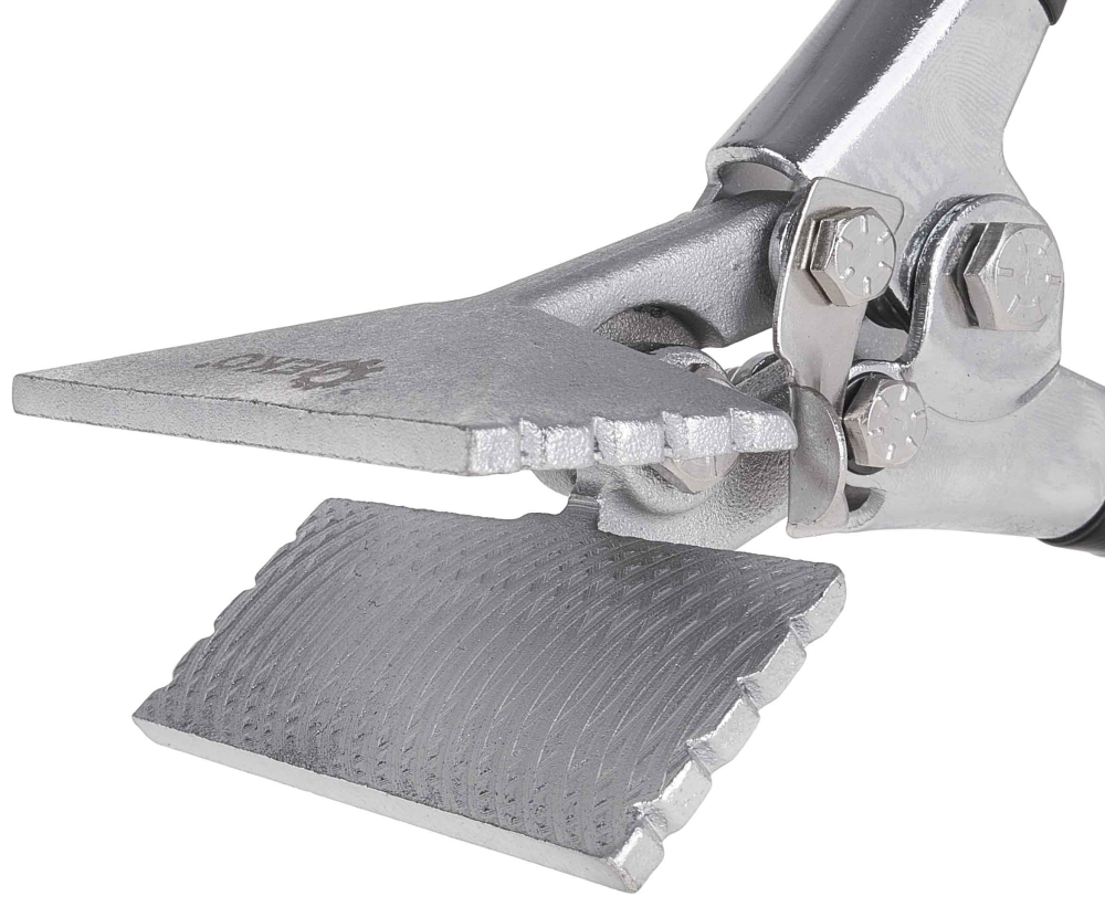 Protišmykové zárezy - Kliešte majú na čeľustiach špeciálne drážky, ktoré zvyšujú trenie, čo zabraňuje skĺznutiu plechu a zaisťuje pevný úchop pri práci.