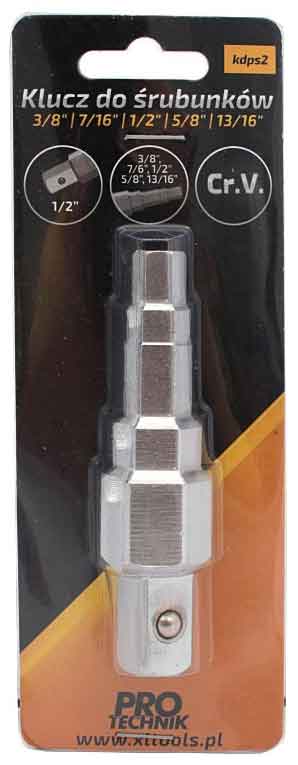 Kľúč na riadiátorové šrúbenie 1/2'' je nástroj určený na montáž a demontáž polovičných spojok, spojok s vonkajším závitom a ventilov kúrenia. Má päťstupňové prevedenie umožňujúce prácu s prvkami rôznych priemerov. Vyrobené z chróm-vanádiovej ocele (CrV), ktorá zaisťuje pevnosť a dlhú životnosť. Rukoväť nástroja je navrhnutá pre prácu so štandardnou račňou 1/2".Vlastnosti: