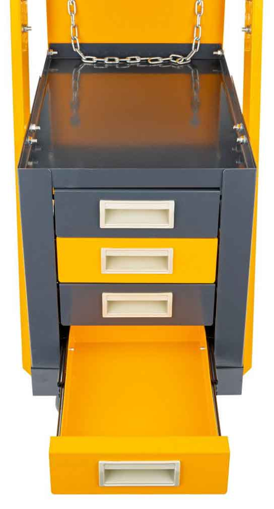Vozík je vybavený štyrmi zásuvkami, ktoré umožňujú efektívne riadenie pracovného priestoru . Toto riešenie poskytuje zváračovi rýchly a jednoduchý prístup ku všetkým potrebným nástrojom a príslušenstvu, čo sa premieta do zvýšenej efektivity práce .