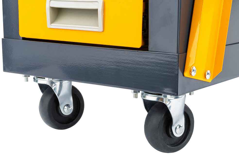 Pohodlná rukoväť a ďalšie úchyty uľahčujú manévrovanie s vozíkom a premiestňovanie vybavenia po dielni.