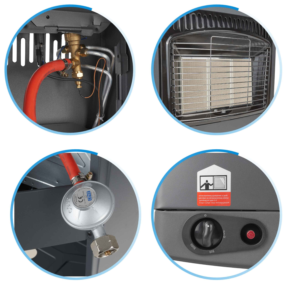 Plynový ohrievač s vykurovacím výkonom 4,2 kW je efektívnym a všestranným riešením vykurovania, ideálnym na vykurovanie väčších miestností. Kachle vybavené keramickým výhrevným telesom a tromi úrovňami tepelného výkonu ( 1,5 kW, 2,8 kW a 4,2 kW ) umožňujú prispôsobiť intenzitu vykurovania aktuálnym potrebám užívateľa a zabezpečiť tepelnú pohodu v chladnejších dňoch. Produkt je poháňaný štandardnou 11 kg propán/butánovou fľašou a v prípade potreby je možné použiť menšie fľaše pomocou špeciálneho adaptéra. Sada obsahuje redukciu a hadicu, čo umožňuje okamžitú inštaláciu a použitie.Technické špecifikácie:
