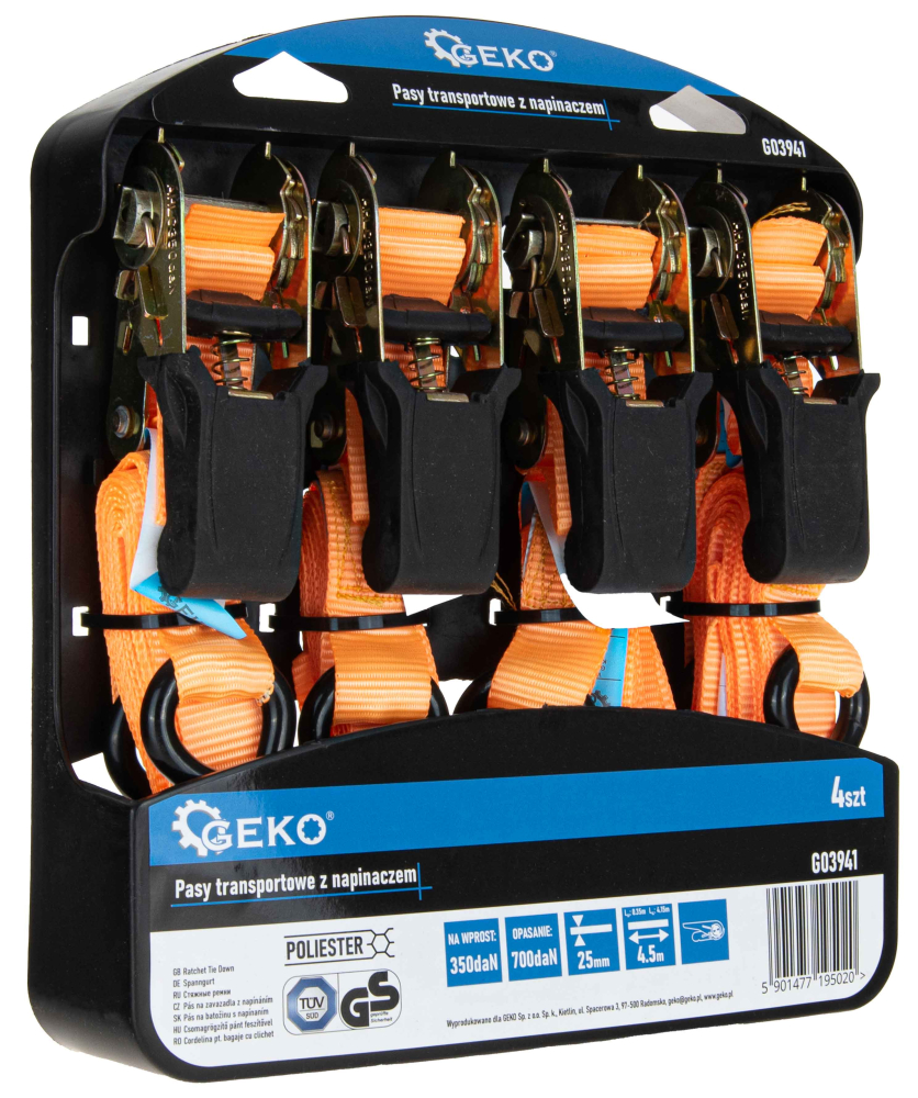 Remeň upínací s račňou 700 kg, sada 4 ks, 25 mm x 4,5 m, GEKO