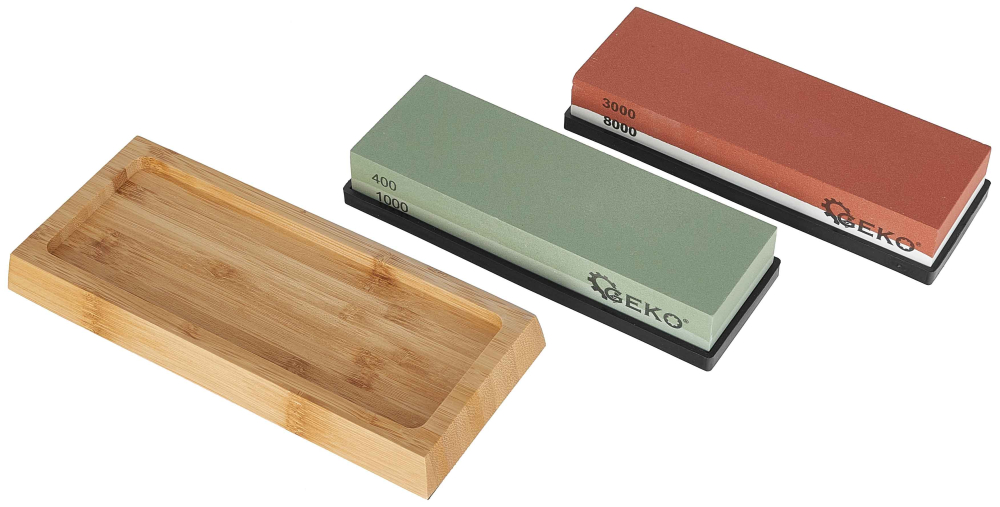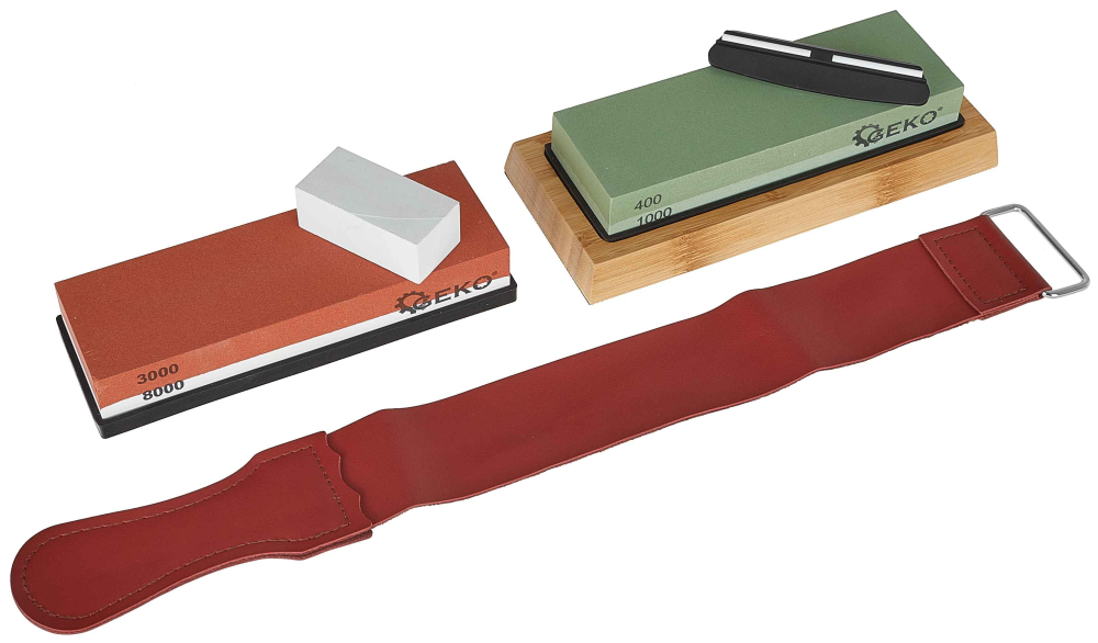 - Sada brúsnych kameňov s vodiacou lištou a koženým pásom, zrnitosť 400-8000, GEKO