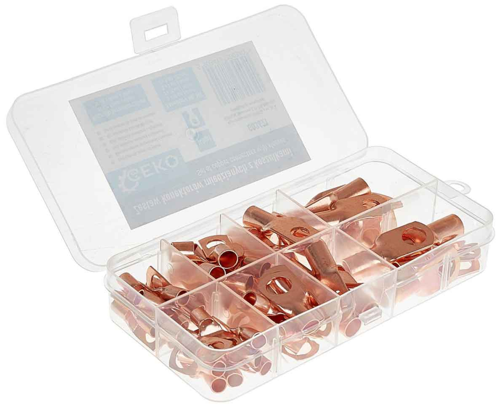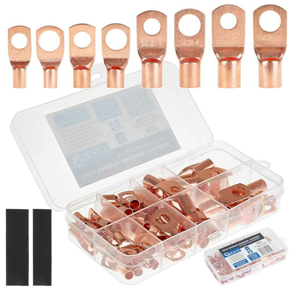 Kompletná, praktická sada medených káblových očiek typu SC a zodpovedajúcich zmršťovacích bužírok. Ideálna na vytváranie rýchlych a odolných elektrických spojení v automobilovom, priemyselnom, fotovoltaickom, dielenskom a domácom priemysle. Všetko je zabalené v praktickej, priehradkovej krabici pre organizáciu a rýchly prístup k rozmerom.