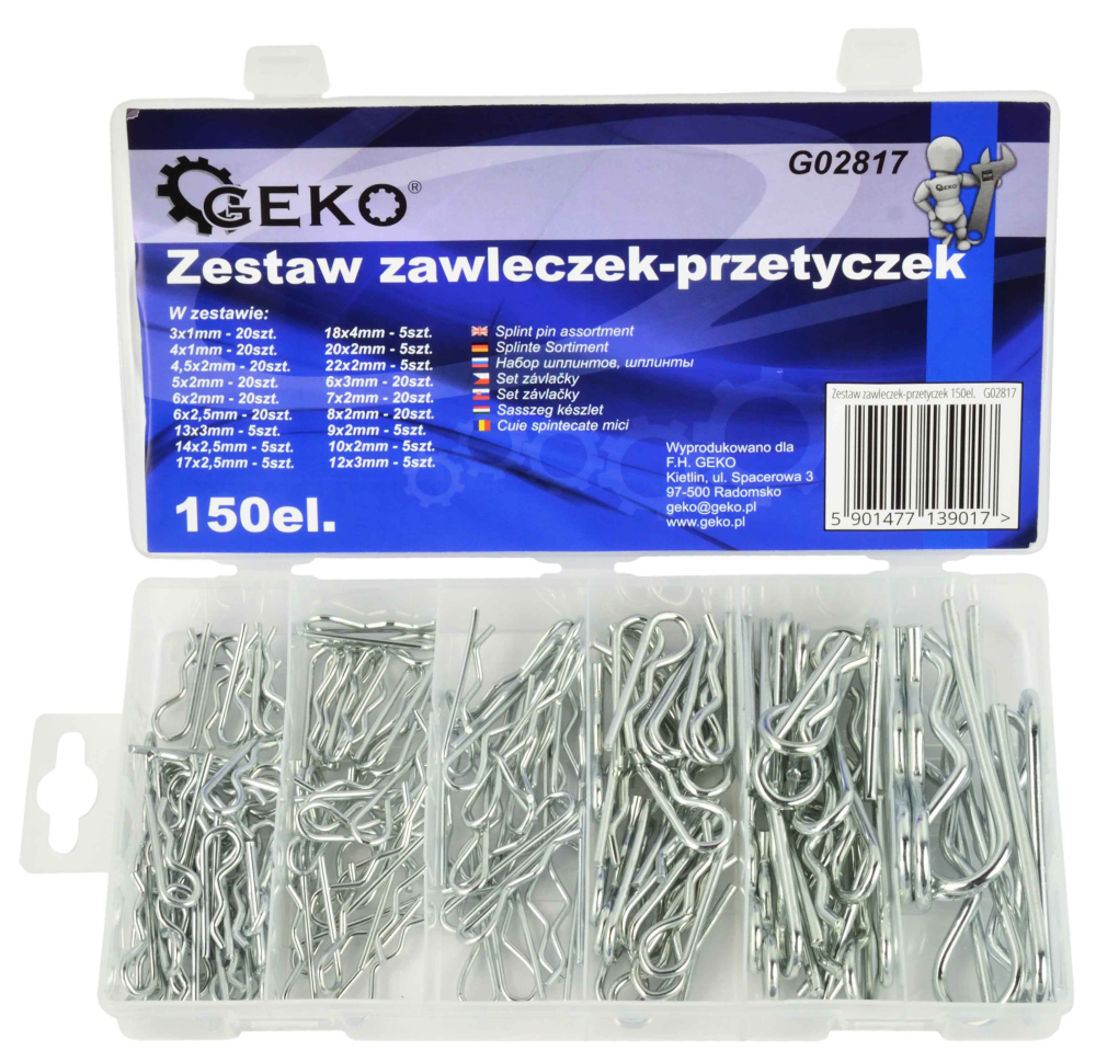 Sada závlačiek je kompletné riešenie pre zabezpečenie prvkov na hriadeľoch, nápravách a čapoch proti skĺznutiu. Obsahuje 150 prvkov v šiestich rôznych veľkostiach, vhodných pre rôzne aplikácie v dielňach, autoservisoch a domácich garážach. Špendlíky sú balené v plastovom organizéri s priehradkami, čo uľahčuje skladovanie a prepravu.Vlastnosti: