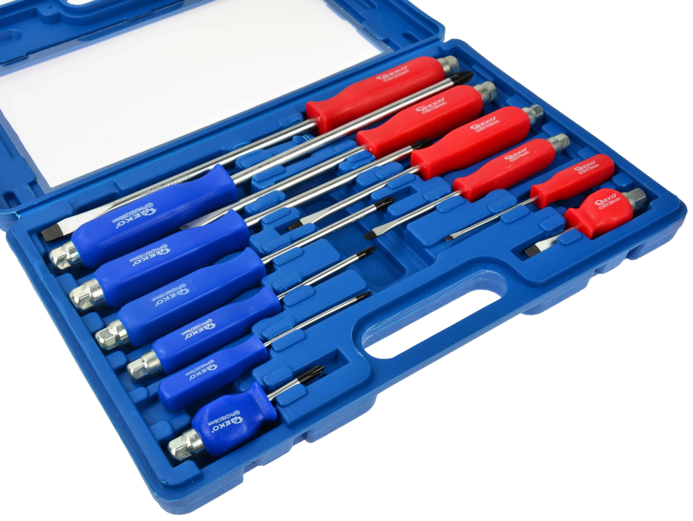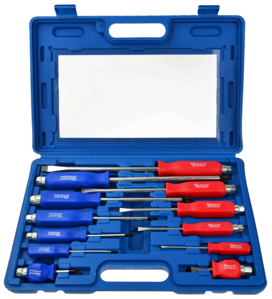 Sada dvanástich úderových skrutkovačov z chróm-vanádiovej ocele.Driek skrutkovača prechádza celou rukoväťou, je zakončený kovovou hlavou so šesťhrann, takže ho možno použiť s kľúčom a výborne sa hodí na prácu s kladivom.