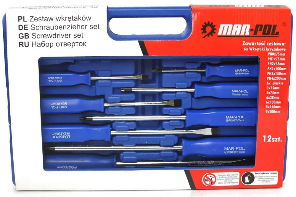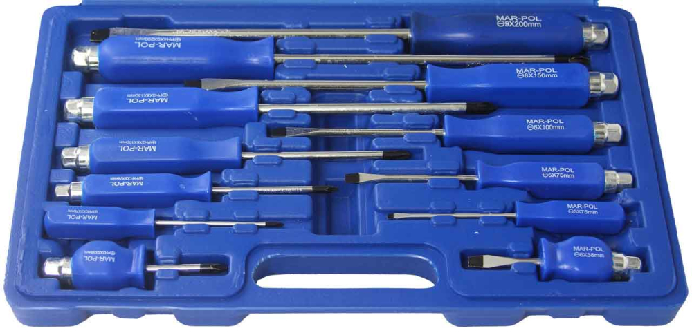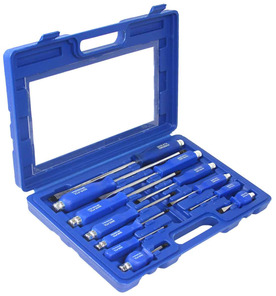 Sada 12 ks zámočníckych skrutkovačov. Driek prechádzajúci rukoväťou zakončený šesťhranným pohonom pre podopretie kľúčom Prierez rukoväte a drieku je šesťhranný. Magnetické konce. Materiál: CrV, hroty dodatočne tvrdené.Ploché skrutkovače: