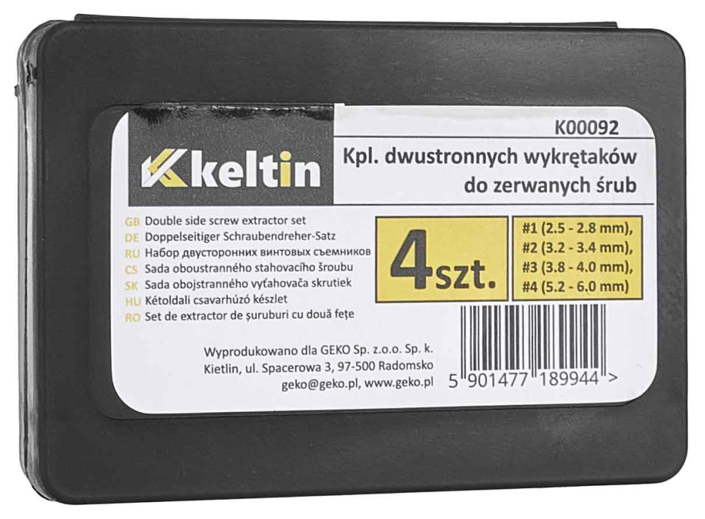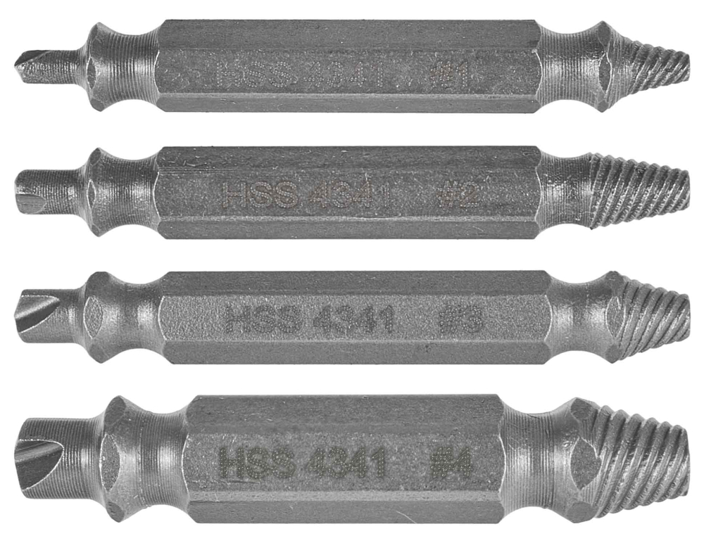 Univerzálny vyťahovač skrutiek vyrobený z rýchloreznej nástrojovej ocele HSS. Navrhnuté na prácu v štandardnej vŕtacej hlave.Popis: Vyťahovač zlomených skrutiek HSS 4341 4 ks je sada univerzálneho náradia na odstránenie zlomených skrutiek. Vyťahovače sú vyrobené z rýchloreznej nástrojovej ocele HSS, čo zaručuje ich odolnosť a účinnosť. Sada obsahuje štyri rôzne veľkosti: 1, 2, 3, 4, ktoré sa hodia na štandardné vŕtacie hlavy. Pomocou tohto nástroja ľahko a efektívne odstránite zlomené skrutky.