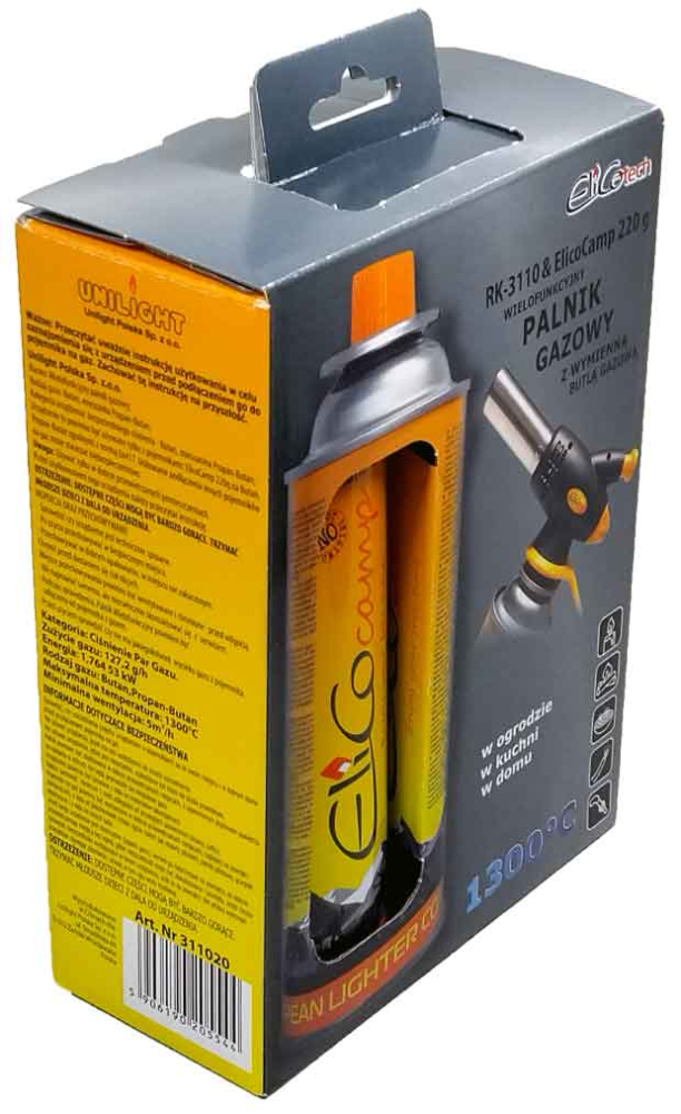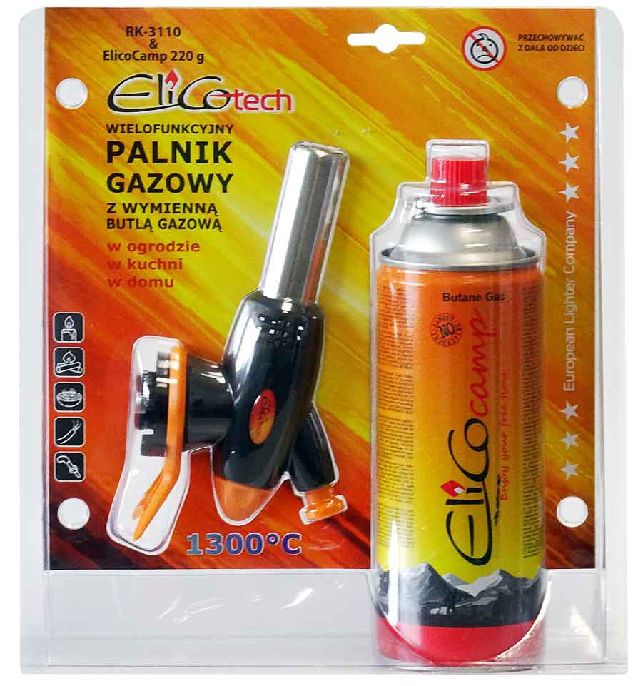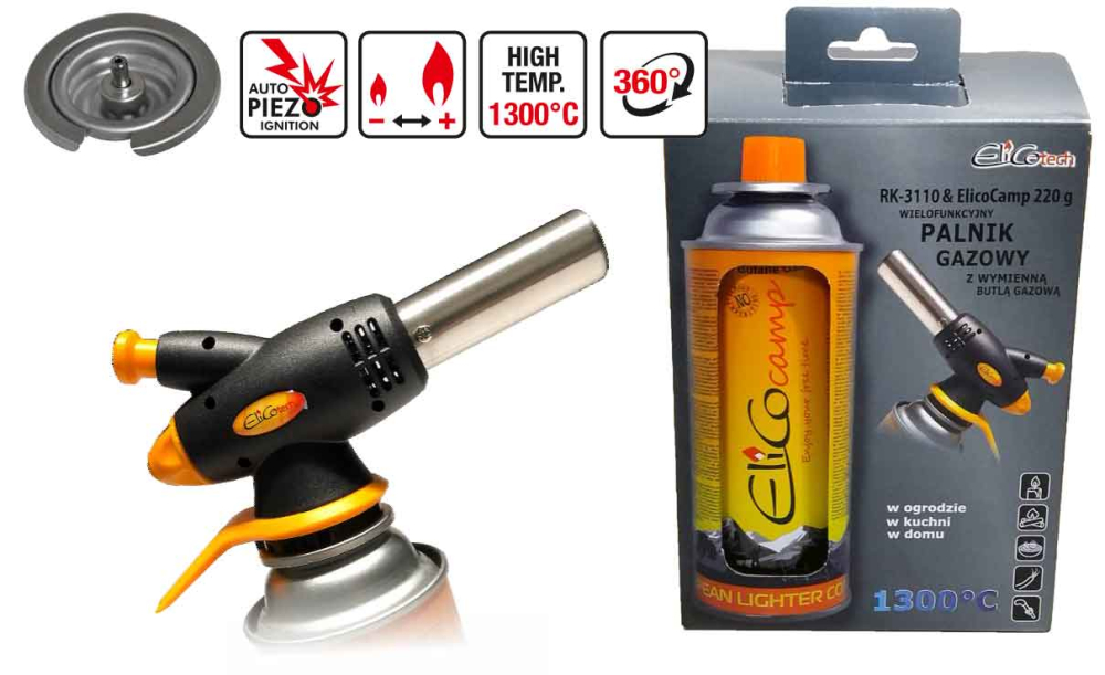 Spájkovacia lampa s piezo zapaľovačom a kartušou 220g, otočný uzáver, ELICO