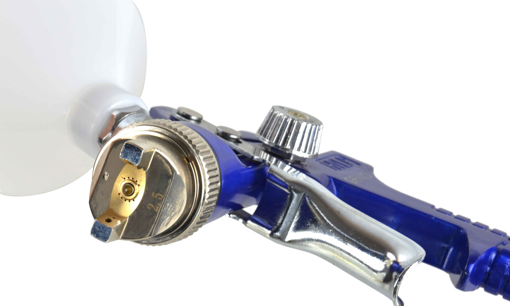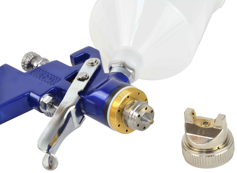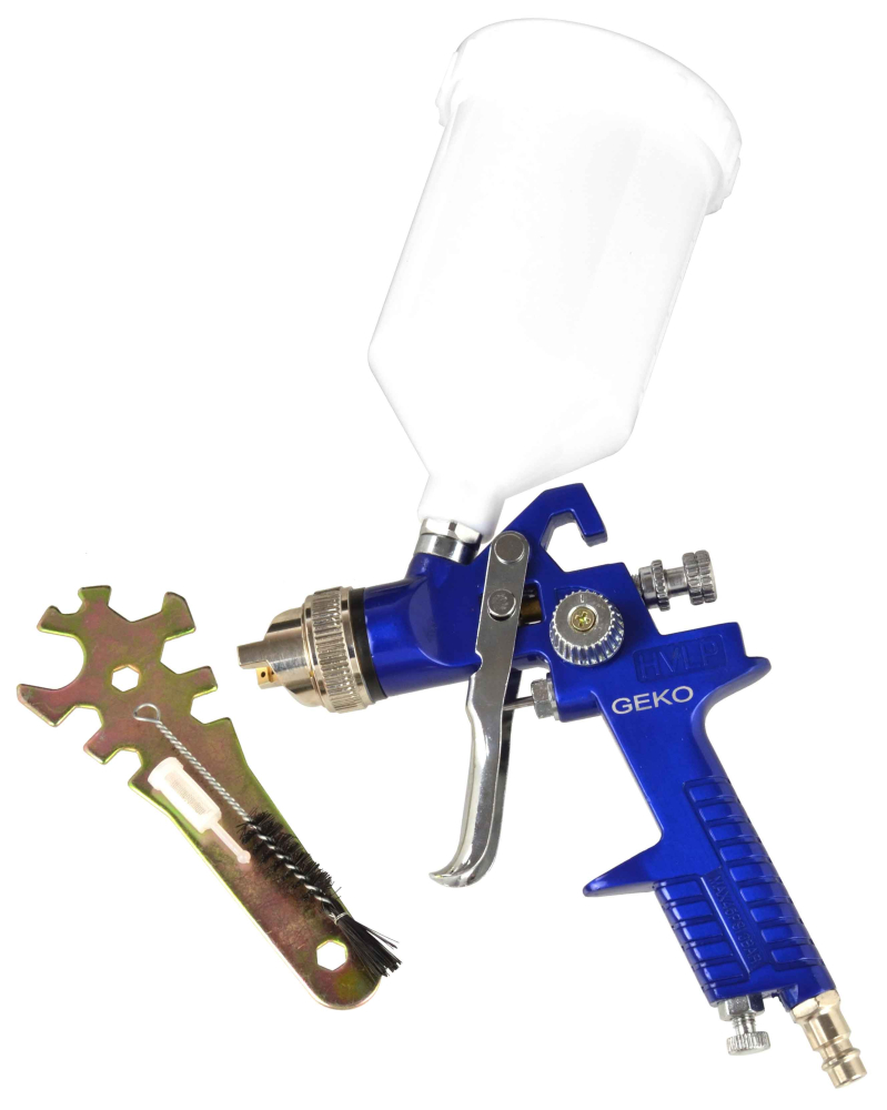 Profesionálna striekacia pištoľ HVLP. Vyrobené z najkvalitnejších materiálov. Pištoľ je poháňaná stlačeným vzduchom. Vzduch z kompresora sa dostáva do nádrže na farbu a do trysky pištole. Výsledný tlak "vytlačí" kvapalinu z nádrže a nastriekané častice farby sú vrhané cez trysku na lakovaný povrch.Použitá technológia HVLP (High Volume Low Presure) umožňuje vypustenie veľkého objemu farby, zatiaľ čo nízky tlak vzduchu tlačí farbu cez dýzu . V dôsledku toho sa vyfukovaným vzduchom stráca menej farby a viac padá na lakovaný povrch, čo znižuje spotrebu farby.