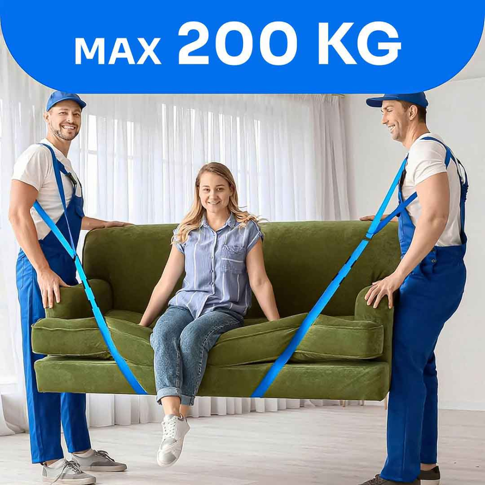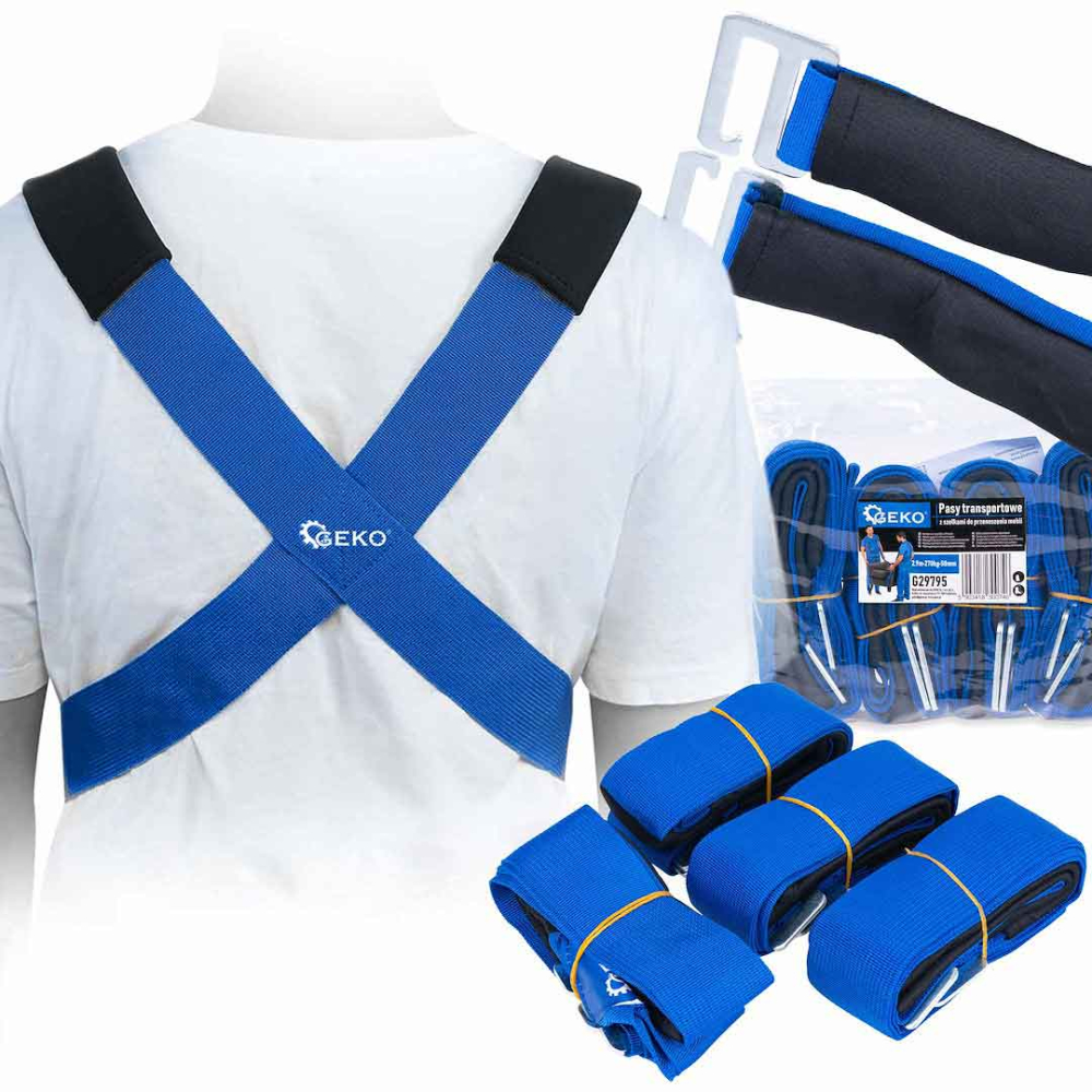 Sada 4 transportných pásov pre pohodlný a stabilný presun ťažkých a objemných predmetov, ako sú skrine, chladničky, práčky a police.Nosnosť až 270 kg a šírka 50 mm zaisťujú rovnomerné rozloženie záťaže, čím sa minimalizuje riziko poškodenia a zranenia.